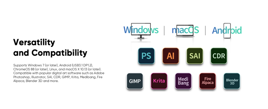 Performanță maximă cu stiloul inteligent X3 Pro Smart Chip Noul XP-PEN Artist 13.3 Pro V2 a fost actualizat pentru a fi compatibil cu stiloul X3 Pro Smart Chip, oferind o experiență de desenare ultra-precisă. Cu 16.000 de niveluri de presiune, stiloul permite trasarea unor linii fine, fluide și naturale, simulând perfect senzația de desen pe hârtie. Include, de asemenea, două butoane pentru acces rapid și o gumă digitală, ceea ce sporește eficiența creativă. Lasă culorile să prindă viață Ecranul pentru desen redă cu fidelitate frumusețea culorilor naturale, având un spectru de culoare de 99% sRGB și o luminozitate de 250 cd/m². Tehnologia de laminare completă și folia antireflex reduc distanța dintre vârful stiloului și afișaj, minimizând reflexiile pentru o experiență creativă fluentă și neîntreruptă. Ușor, dar puternic Cu o greutate de doar 1,13 kg, această tabletă grafică de 13,3 inci este suficient de portabilă pentru a crea oriunde. Dacă sunteți stângaci, nu vă faceți griji – ecranul de desen poate fi ajustat din setările driverului, iar comenzile rapide de la tastatură pot fi personalizate pentru a se potrivi mâinii dumneavoastră dominante. Versatilitate și compatibilitate Tableta grafică Artist 13.3 Pro V2 este compatibilă cu multiple sisteme de operare și aplicații software. Suportă Windows 7 (sau versiuni mai noi), Android (USB 3.1 DP 1.2), ChromeOS 88 (sau versiuni mai noi), Linux și macOS X 10.13 (sau versiuni mai noi). De asemenea, este compatibilă cu cele mai populare programe de artă digitală, precum Adobe Photoshop, Illustrator, SAI, CDR, GIMP, Krita, MediBang, Fire Alpaca, Blender 3D și multe altele. Un singur ecran, posibilități infinite Artist 13.3 Pro V2 este conceput pentru a răspunde nevoilor diverse atât ale profesioniștilor, cât și ale pasionaților. Performanța sa oferă o experiență creativă captivantă, făcându-l ideal pentru ilustrație, animație, design 3D, editare foto și multe altele.