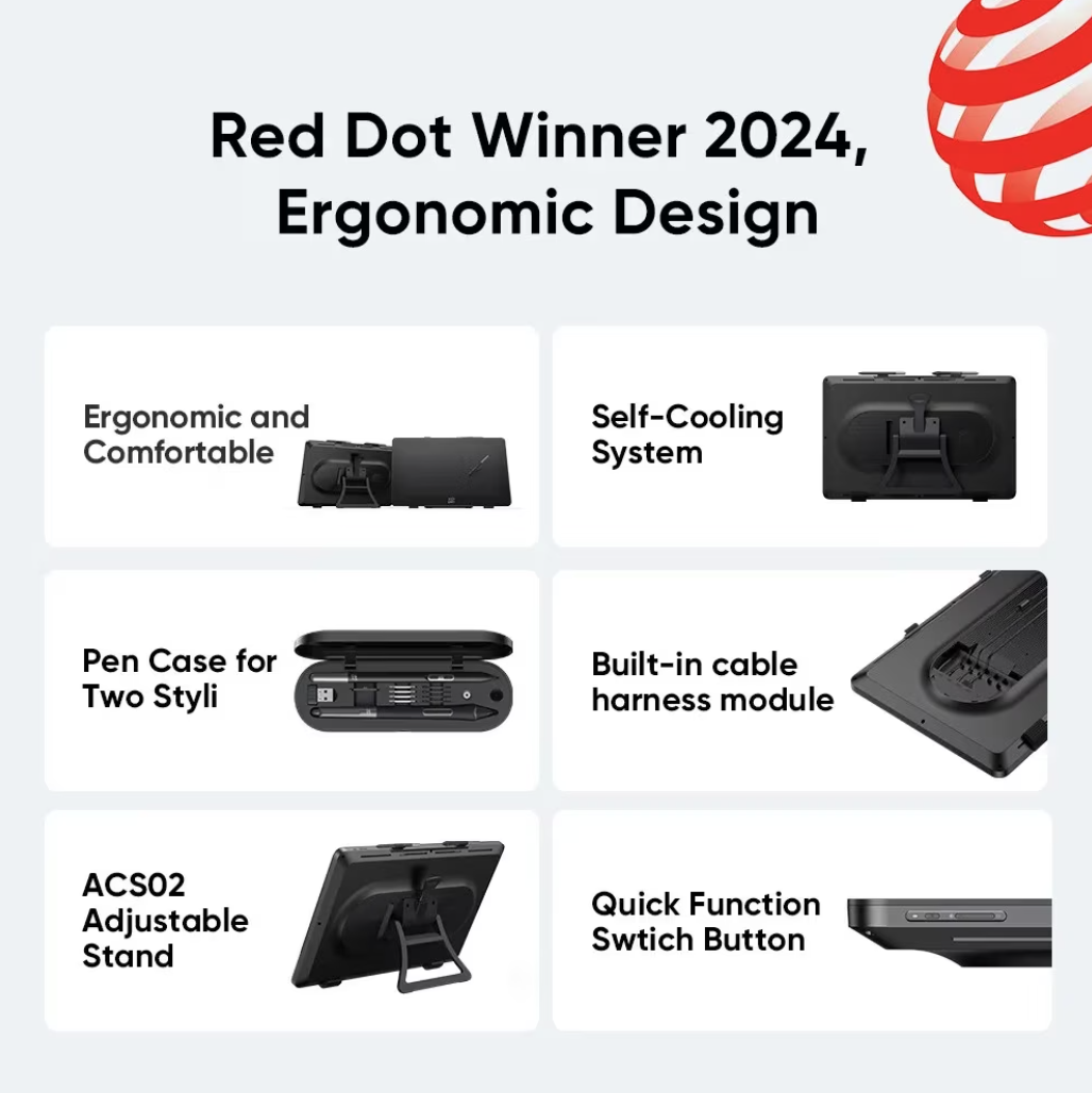 Suportul ACS02 permite ajustarea unghiului cu o singura mana, de la 16° la 72°, adaptandu-se diverselor medii creative pentru un confort personalizat si reducerea oboselii in sesiunile lungi de desen. Optional, suportul ACS15 ofera ajustare suplimentara a inaltimii, posibilitatea de creare sub birou si rotire, sporind versatilitatea si confortul in procesul creativ.