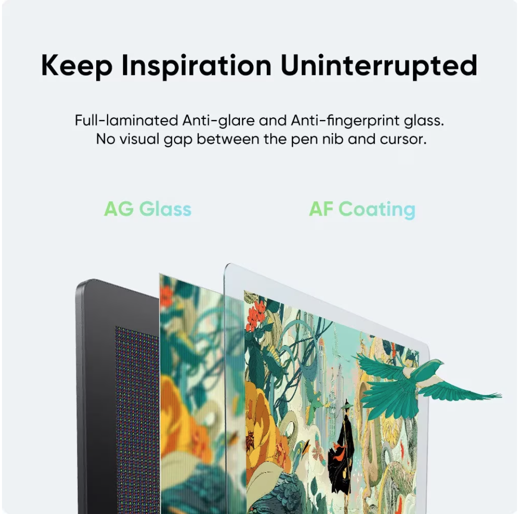 Ecranul dispune de sticla cu acoperire AG Nano Etched si AF Coating, oferind o experienta de desen similara hartiei prin reducerea reflexiilor si a amprentelor. Afisajul complet laminat elimina gaps-urile vizuale dintre varful stiloului si cursor, sporind precizia si acuratetea fiecarei trasaturi.